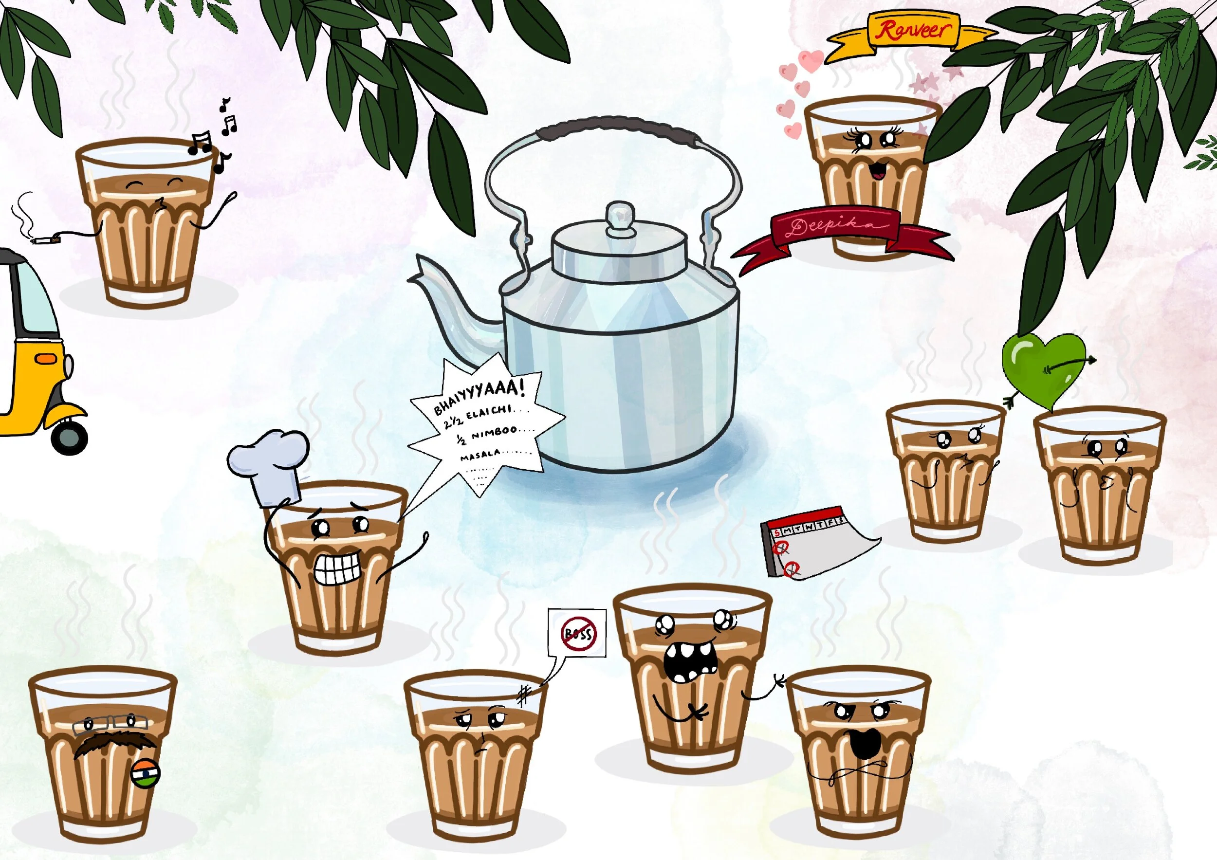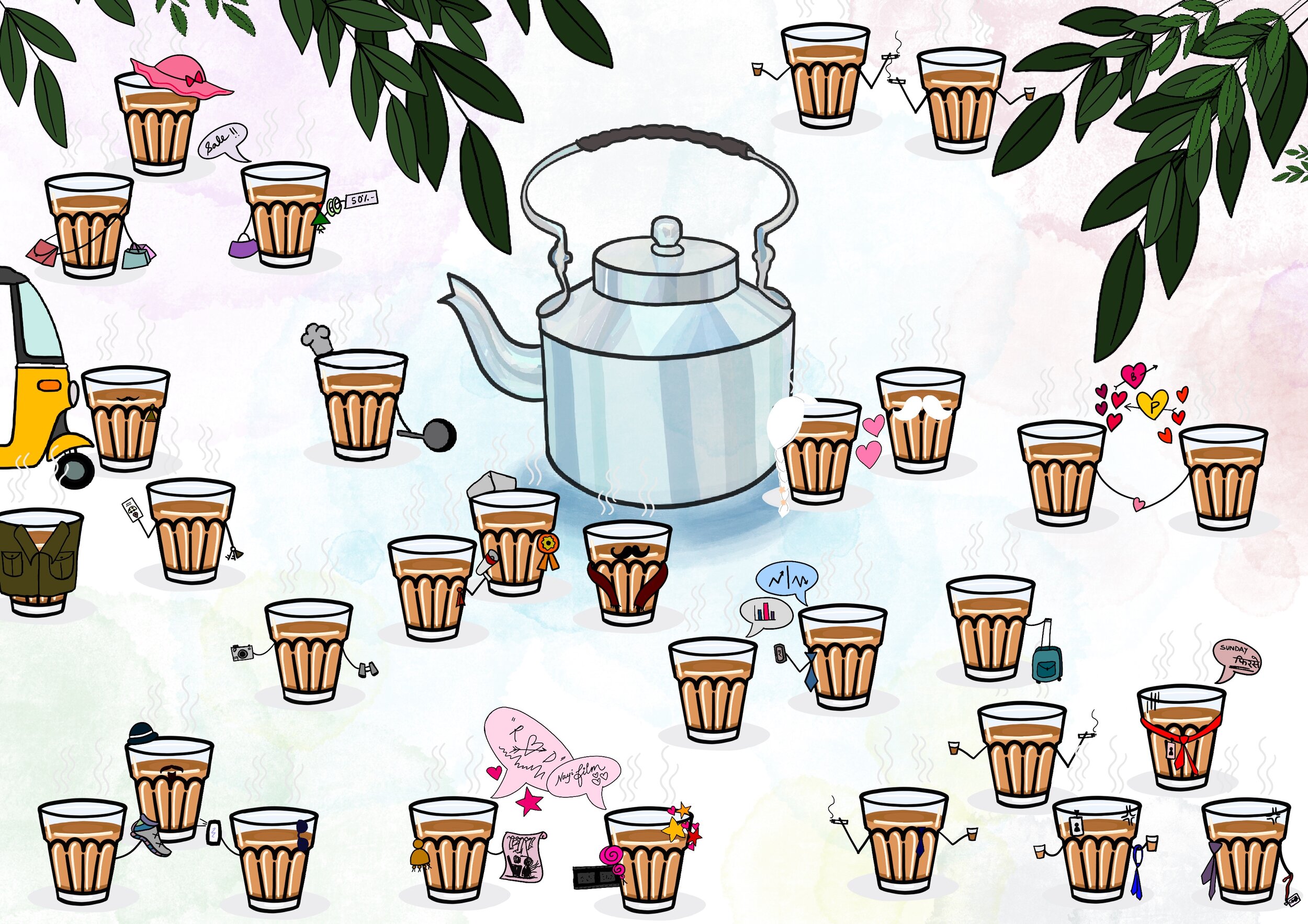 Each character / every different kind of person who visits the chai tapri is shown as a glass of cutting chai